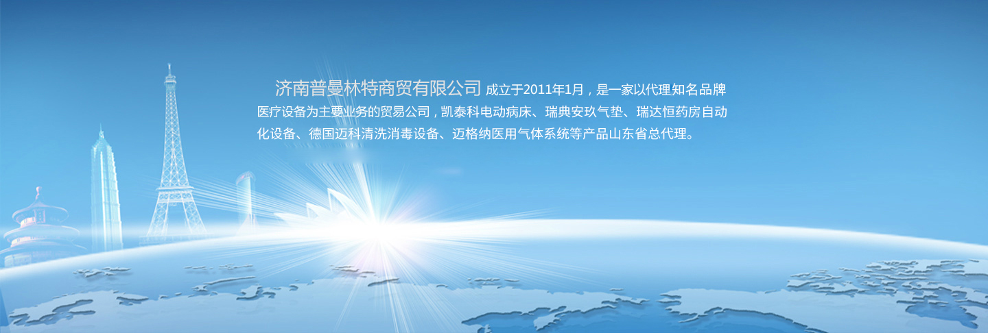 濟南普曼林特商貿有限公司成立于20111月,是一家以代理知名品牌醫療設備為主要業務的貿易公司,還是凱泰科公司系列產品(凱泰科醫用轉移車、凱泰科電動起立床、凱泰科電動病床)、瑞典安玖公司系列產品(安玖電動病床、安玖多功能體位輔助設備、安玖醫用防褥瘡氣墊、安玖移位升降機、安玖主動充氣壓力系統、安玖轉運車)、北京瑞達恒藥房自動化設備、德國邁科清洗消毒設備、邁格納醫用氣體系統等產品山東省的總代理。